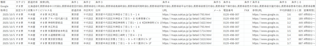 CSVファイルの列: 店舗名、住所、郵便番号、電話番号、FAX番号、メールアドレス、営業時間、ホームページURL、口コミ件数、評価